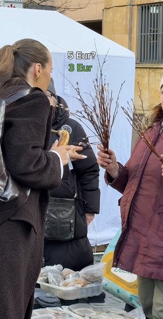 Iš maisto gaminių nuomonės formuotoja domėjosi tinginiu, kurio kaina buvo 2 eurai už 100 gramų, taip pat gabaliuku sūrio su paprika, kainavusiu 5 eurus. Šimtalapio gabalėlis kainavo 9 eurus, o didelis širdelės formos meduolis – 8 eurus. Kačiukų puokštelės buvo parduodamos po 3 eurus.